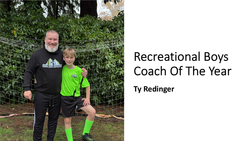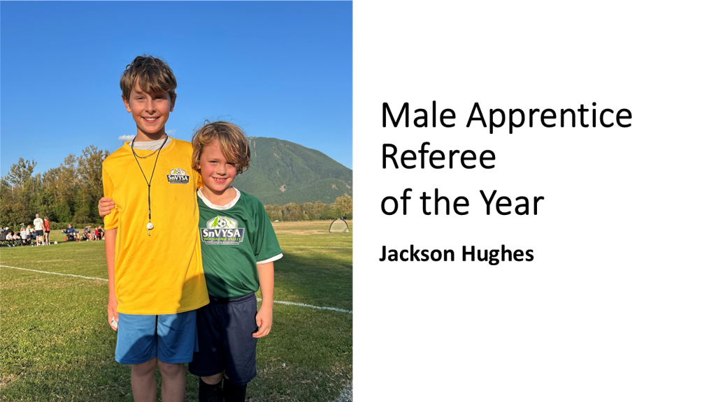 SnVYSA polls the families of the teams every October to nominate a coach, referee, or volunteer they feel has demonstrated exceptional leadership and success during the season. The SnVYSA Board reviews the nominations and selects an "Of the Year Award" for both a Male and Female category for Coach and Referee of the Year, and a single Volunteer of the year award.