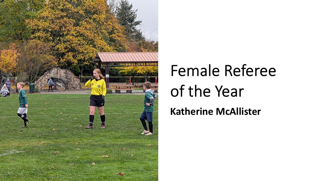 Katie resides in North Bend with her parents and siblings. She is a freshman at Mount Si High School and soccer has been a part of her for most of her life. She played with SnVYSA for seven years, which gave her a strong love for the game and a lot of great experiences as a player. Two years ago, she started refereeing, and it’s been a cool way for her to see soccer from a different perspective while staying involved. For Katie, refereeing is about giving back to the sport she grew up with and making sure the game stays fun and competitive for everyone.